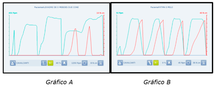 Durante a fase cirúrgica para a instalação dos implantes, os motores que utilizamos para a realização desses procedimentos, com maior ou menor precisão, fornecem uma medida de força mecânica (torque), que permite a aferição da estabilidade mecânica primária. Alguns motores permitem medir tanto o torque utilizado sobre as brocas para o preparo do leito cirúrgico (osteotomia), como o torque de instalação, dando total controle da força empregada na broca e na inserção do implante, além da velocidade aplicada, como podemos ver nos gráficos A e B.