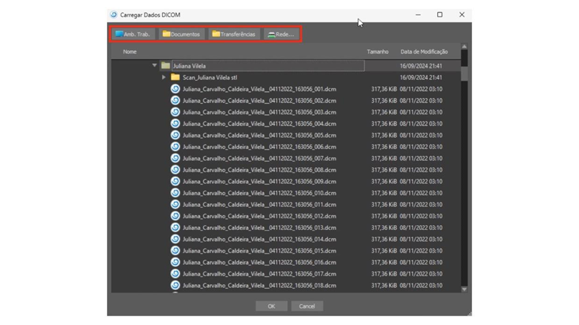 Selecione o diretório que contém as imagens DICOM (você também pode carregar um arquivo zipado com as imagens DICOM) e clique em “OK”. As imagens devem ser armazenadas no formato DICOM pelo serviço de radiologia para que possam ser lidas pelo software.