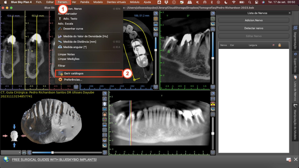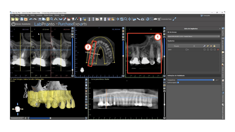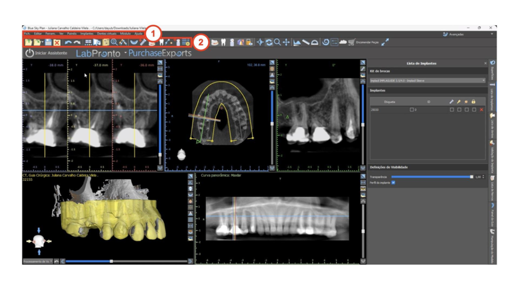 A tela de implante permite a visualização das imagens transversais, tangenciais, axiais, panorâmicas e 3D. Todas as ferramentas de planejamento podem ser acessadas através da barra de menu (1) abaixo; a barra de ferramentas de ícones (2) mostra as ferramentas mais usadas.