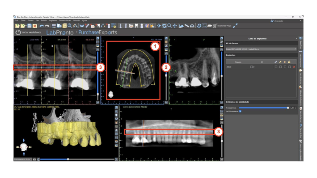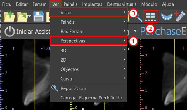 O Blue Sky Plan® permite a interação perfeita entre as várias janelas, exibindo as imagens axial, sagital, coronal, transversal, tangencial, panorâmica e 3D. Dependendo do que for pretendido, é possível selecionar a janela ativa para funções multiplanares (axial, sagital, coronal e 3D) ou funções de implante (transversal, tangencial, axial, panorâmica e 3D). O usuário pode alternar entre diferentes perspectivas em “Ver Perspectivas” (1), ou clicando na barra de ferramentas de ícones (2). Em qualquer perspectiva é possível adicionar qualquer janela de visualização na barra de menu “Ver Vistas” (3).