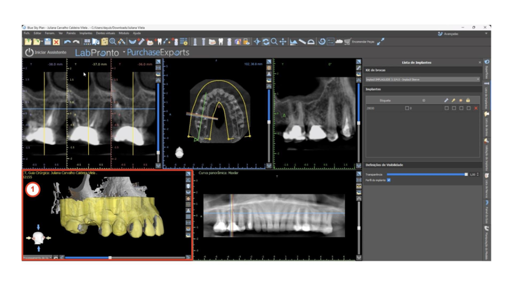 O Blue Sky Plan® permite o planejamento virtual de implantes através das imagens de TC. É possível adicionar, trocar, mover e girar o implante e o pilar ou o pino nas diferentes vistas.