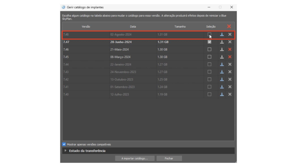 Etapa 2 – na janela “Gerir catálogos de implantes”, clique na versão 7.48 e na seta de download;