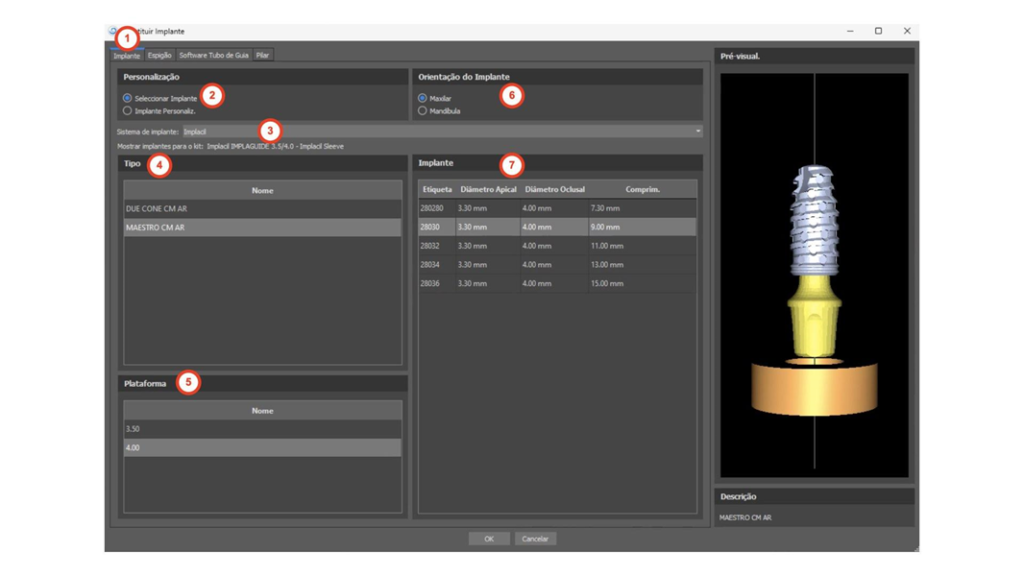 Nesta caixa de diálogo, é possível modificar os parâmetros do implante, o pilar e o guia de perfuração. As partes correspondentes podem ser selecionadas nas guias individuais (1). “Selecionar implante” (2) é selecionado por padrão, o que permite selecionar um implante do catálogo (3) com base em seu tipo (4) e plataforma (5) e, em seguida, de acordo com seus parâmetros (7). Também é possível especificar a orientação do implante (6). O implante atualmente selecionado pode ser visualizado na pré-visualização. Uma breve descrição do implante também está localizada na parte inferior da caixa de diálogo.