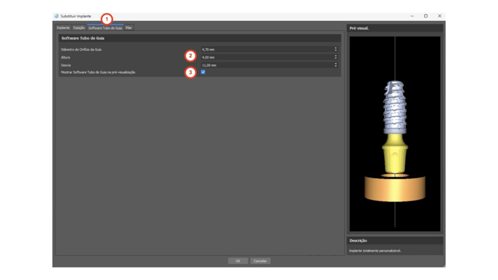 O implante possui uma guia de perfuração auxiliar adicionada por padrão. Se quisermos modificá-lo, é necessário mudar para a guia “Software Tubo de Guia” (1). Seus parâmetros podem ser alterados nos campos correspondentes (2). Se quisermos exibí-lo ou ocultá-lo na visualização, podemos usar a caixa de seleção (3).