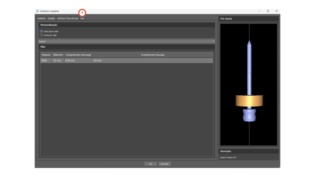 É possível adicionar um pino de fixação (1) para guias cirúrgicas. Este é um pino especial para posicionar e fixar o guia com mais firmeza. Ao contrário de um implante, ele não pode ter um pilar, mas apenas uma guia de broca.