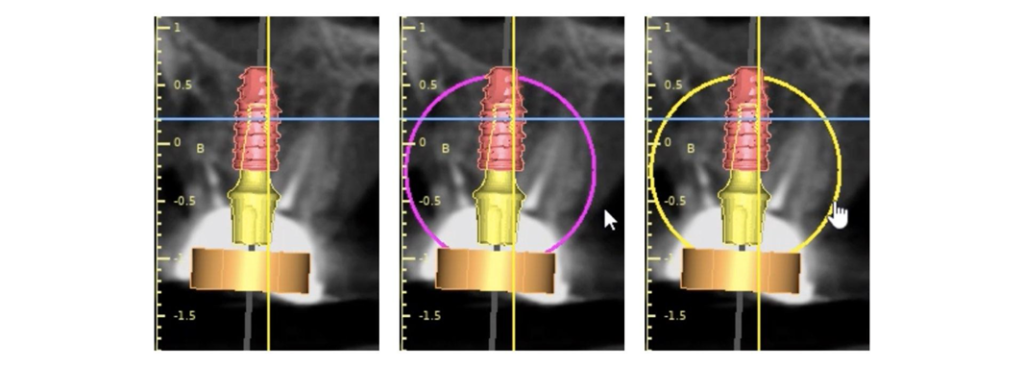 Graças à opção de girar o plano que passa pelo implante, é possível verificar e corrigir com facilidade a inclinação da posição do implante ao visualizar de qualquer ângulo.