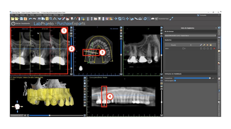 Antes de posicionar o implante, recomenda-se medir primeiro as dimensões do osso. Dessa forma, é possível estimar quais dimensões o implante deve ter. Para abrir a função implantes na barra de menu, vá em Módulo > Guia cirúrgicas > Avançadas. Então, a função “Implante” será ativada na barra de menu. Para inserir o implante, vá em Implantes > Adicionar implante. Na janela “Adicionar novo Implante”, procure a Implacil no sistema de implantes (3).
