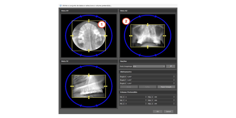 Nesta etapa, você alinha os dados volumétricos e delimita a área de interesse nos dados. E possível cortar os dados em todas as direções, arrastando as linhas amarelas (1) ou definindo diretamente a dimensão da fatia para os eixos individuais.