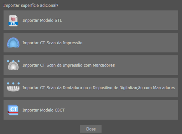 Depois de carregar os dados de TC, o usuário pode importar superfícies adicionais como a primeira opção “Importar Modelo STL”. Após clicar, selecione o diretório que contém o modelo ou a digitalização necessária.
