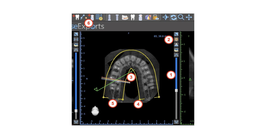 Isso pode ser feito usando o controle deslizante (1) para identificar uma fatia axial que mostra o arco/rebordo completo da mandíbula do paciente. Se necessário, é possível alternar o modo de exibição da fatia axial para uma exibição de raio-x clicando no botão (2). A curva como um todo pode ser alterada arrastando a alavanca vermelha (3) e a largura da curva pode ser ajustada arrastando qualquer alavanca amarela (4). Arrastar a alavanca amarela dentro da curva vai diminuir/aumentar a curva. Arrastar qualquer uma das alavancas cinzas (5) ao longo da curva pode alinhar a curva na posição desejada. Como alternativa, toda a curva pode ser redesenhada pressionando o botão “Desenhar curva dental” (6). O usuário pode clicar com o botão esquerdo periodicamente enquanto o mouse se move pelo arco (da esquerda para a direita), colocando pontos. O software conectará os pontos para desenhar a curva panorâmica. Quando a curva estiver completa, basta clicar duas vezes ou clicar no botão “Desenhar curva dental” (3) novamente, ou pressionar “Esc”.