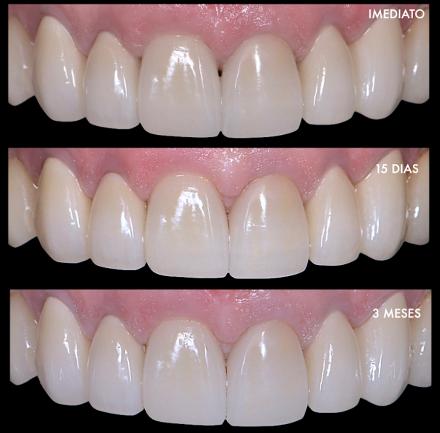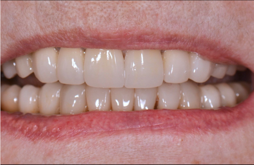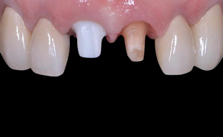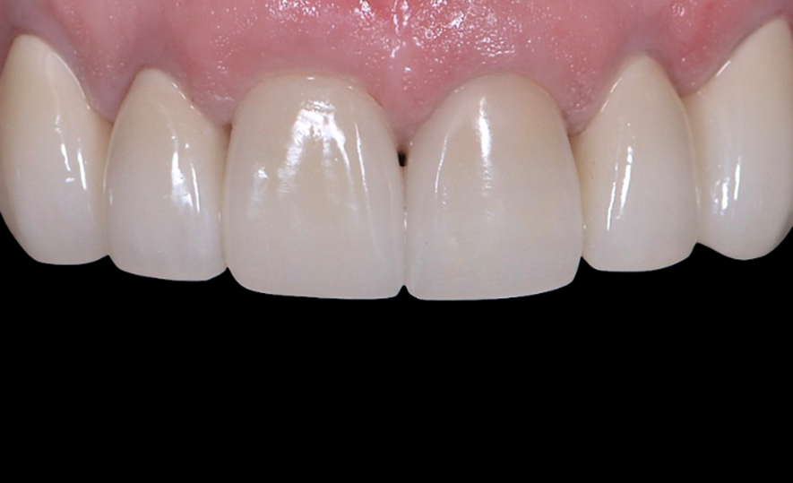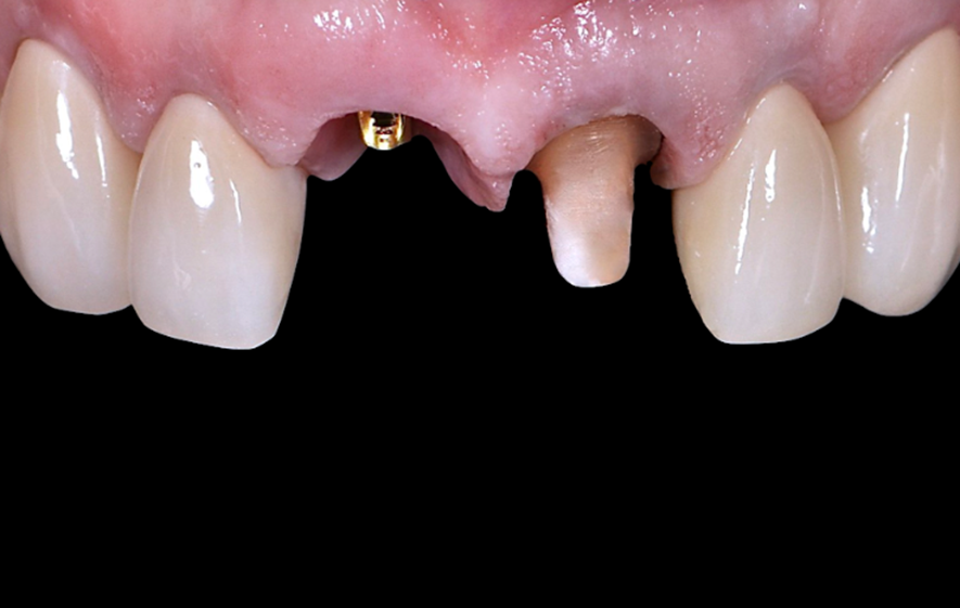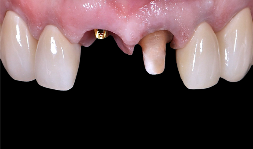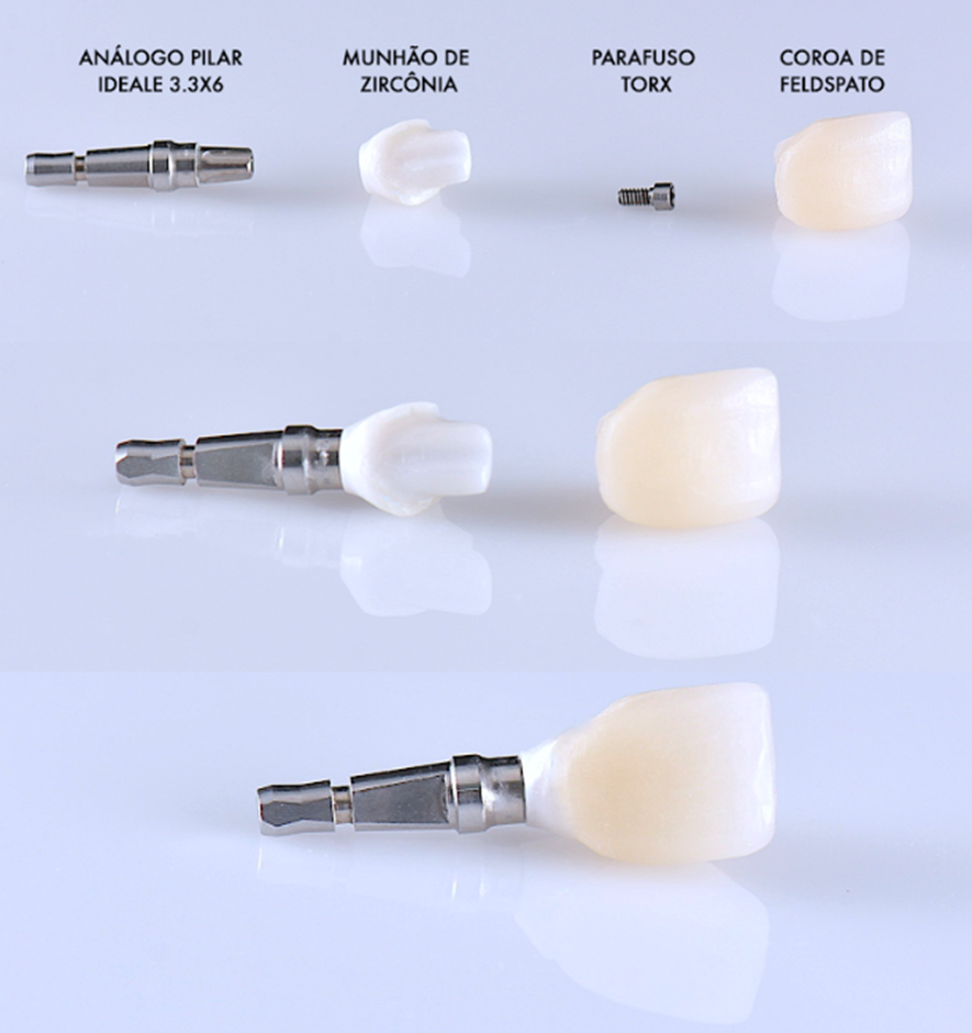 Em seguida, aguardamos por mais 45 dias para maturar o perfil de emergência e alcançarmos estabilidade dos tecidos moles para realizar o escaneamento do pilar Ideale angulado, a fim de reabilitar com um munhão personalizado de zircônia sobre o implante do 11 e duas coroas de feldspato, sendo uma coroa sobre o munhão do 11 e a outra coroa sobre o elemento 21.