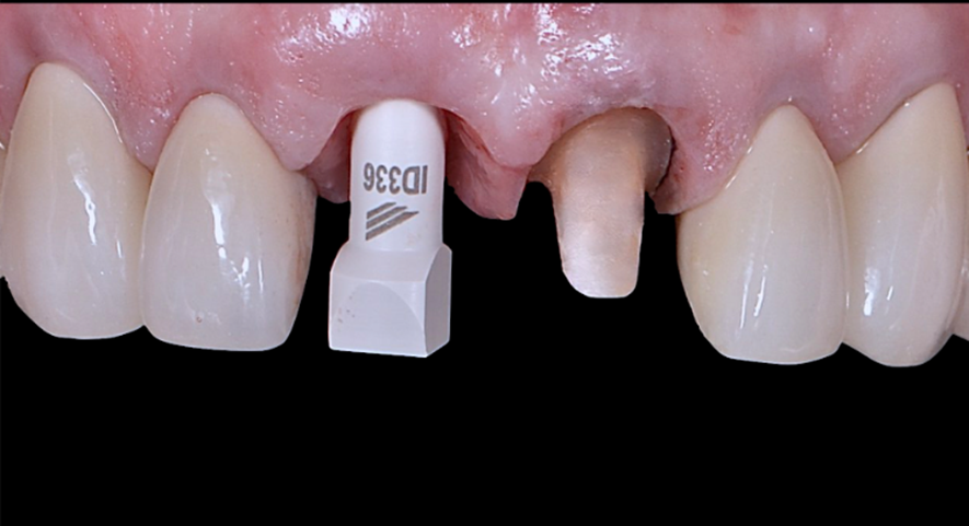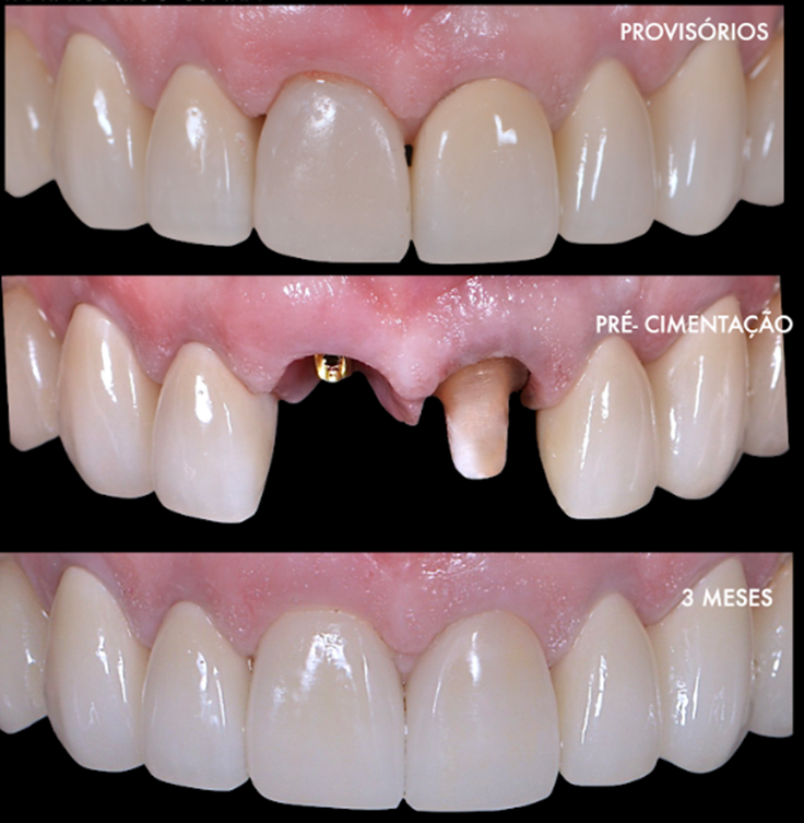 No momento da instalação do implante, instalamos também um cicatrizador customizado impresso a fim de conduzir a osseointegração, a formação e maturação do perfil de emergência.