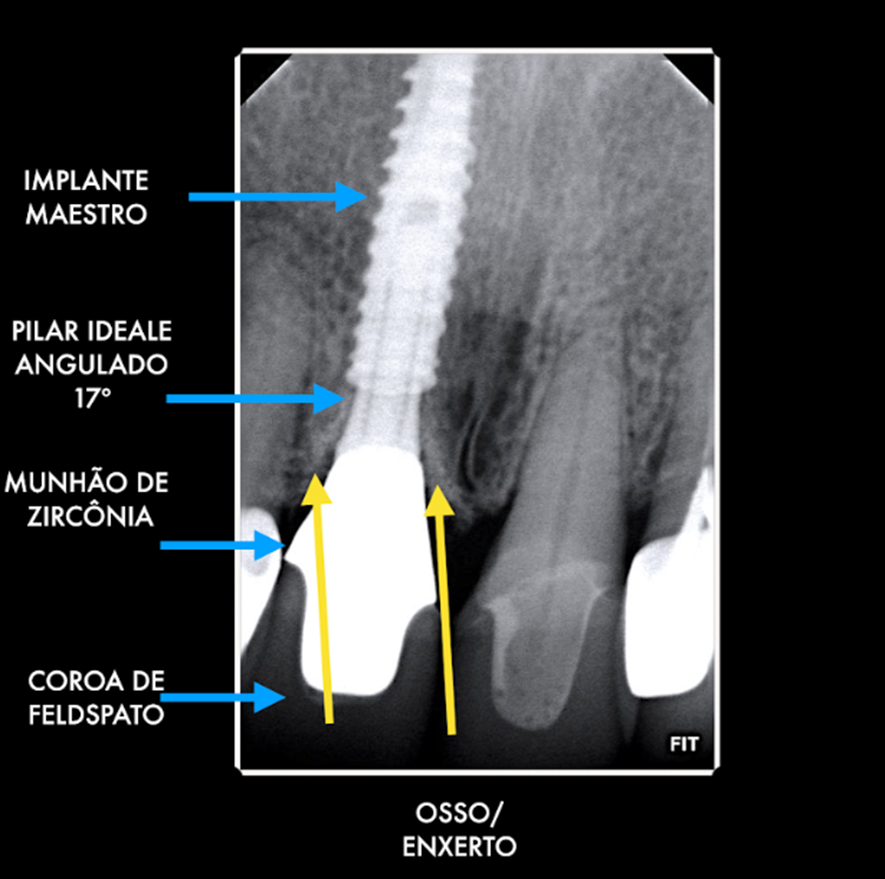 Com isso, visualizamos a necessidade de instalar um pilar Ideale angulado de 17 graus para compensar a vestibularização e instalar a coroa definitiva e provisório parafusado, tudo já observado previamente.