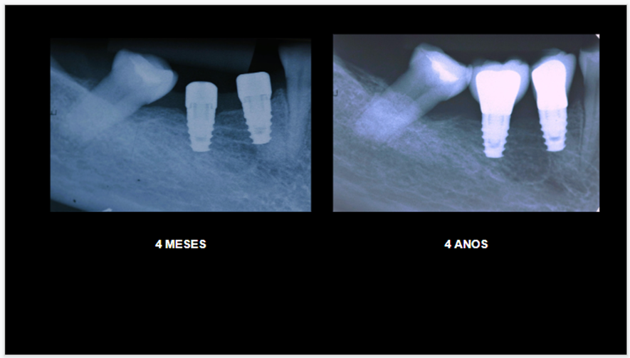 Neste caso clínico, a paciente C.X.M, sexo feminino, 46 anos, saudável, com histórico de doença periodontal, sem condições sistêmicas desfavoráveis e não-fumante, compareceu à clínica de especialização de Periodontia da UNIP. Após terapia periodontal, com a paciente apresentando saúde periodontal, foram instalados, na clínica de especialização, dois implantes do tipo HE, 4.0 X 6.0mm, Implacil De Bortoli. O acompanhamento deste caso clínico vem sendo realizado semestralmente na clínica de pós-graduação stricto sensu do programa de mestrado em Odontologia na área de Periodontia da UNIP, durante a terapia periodontal de suporte, nos últimos quatro anos.