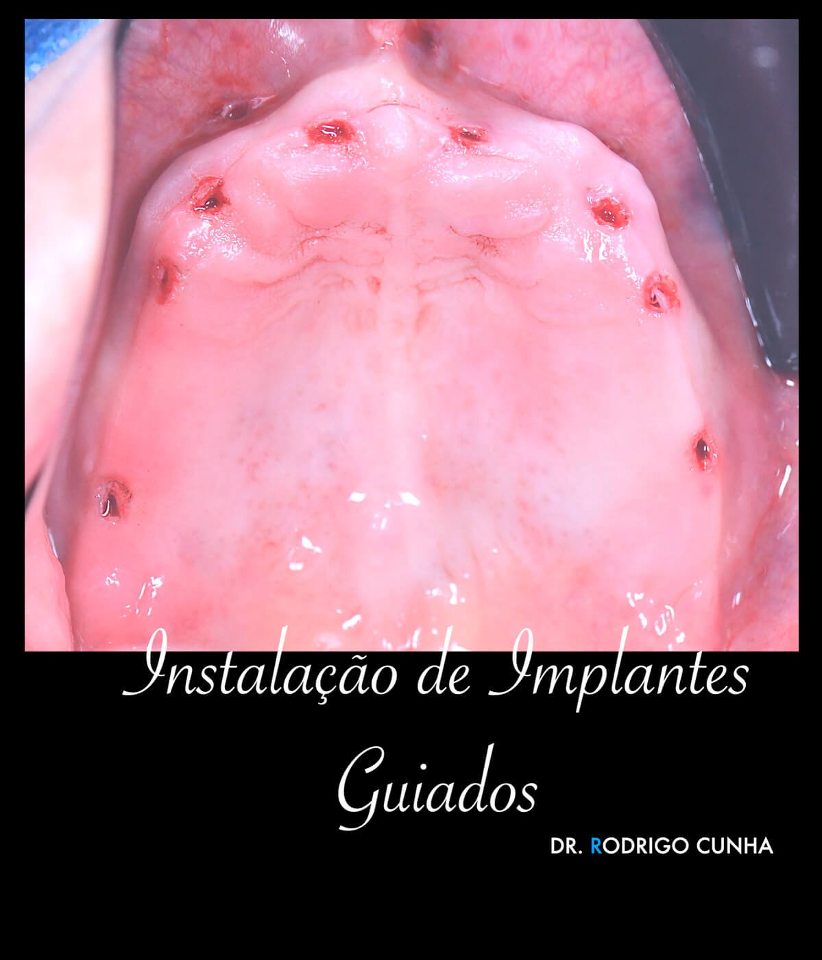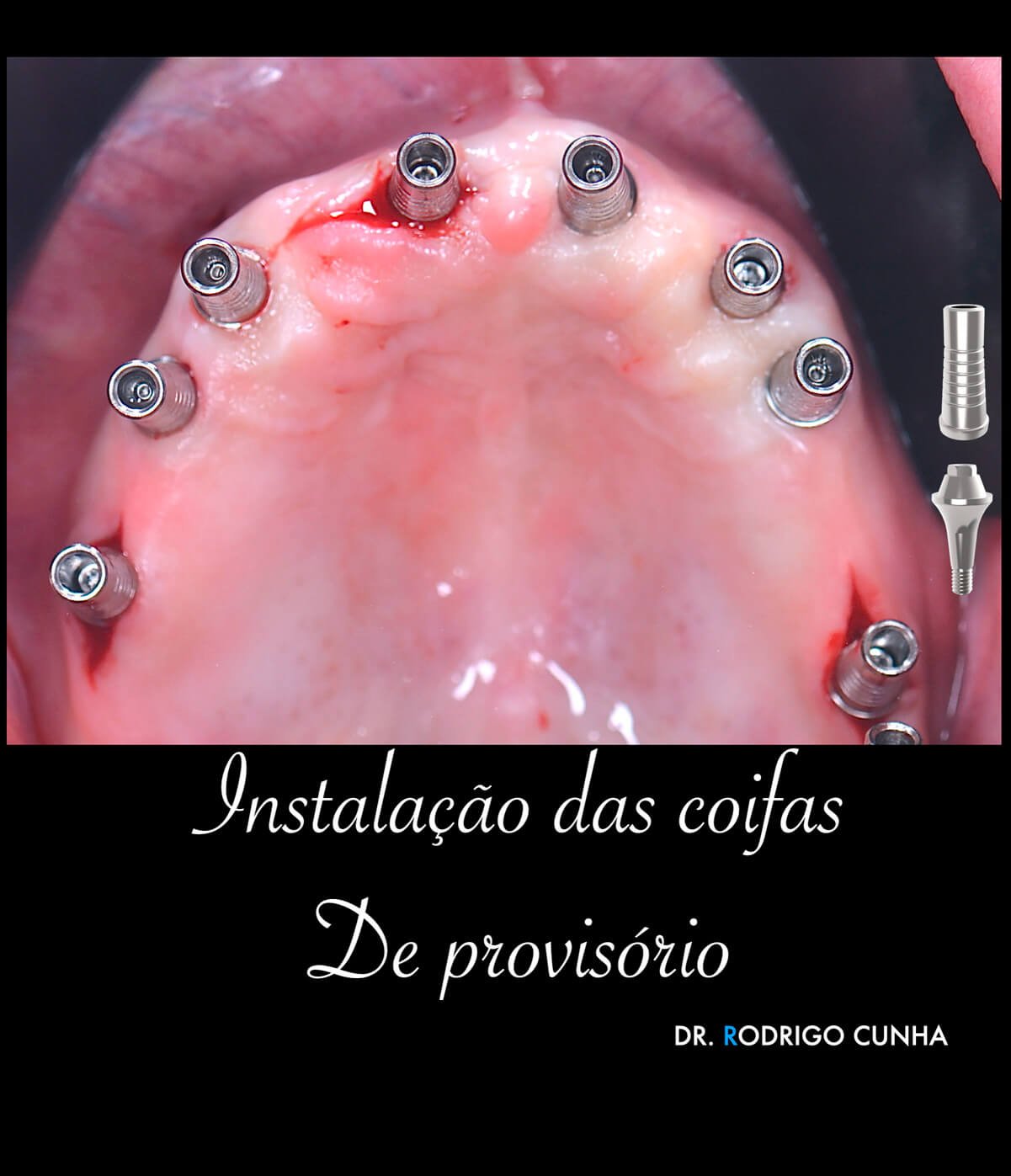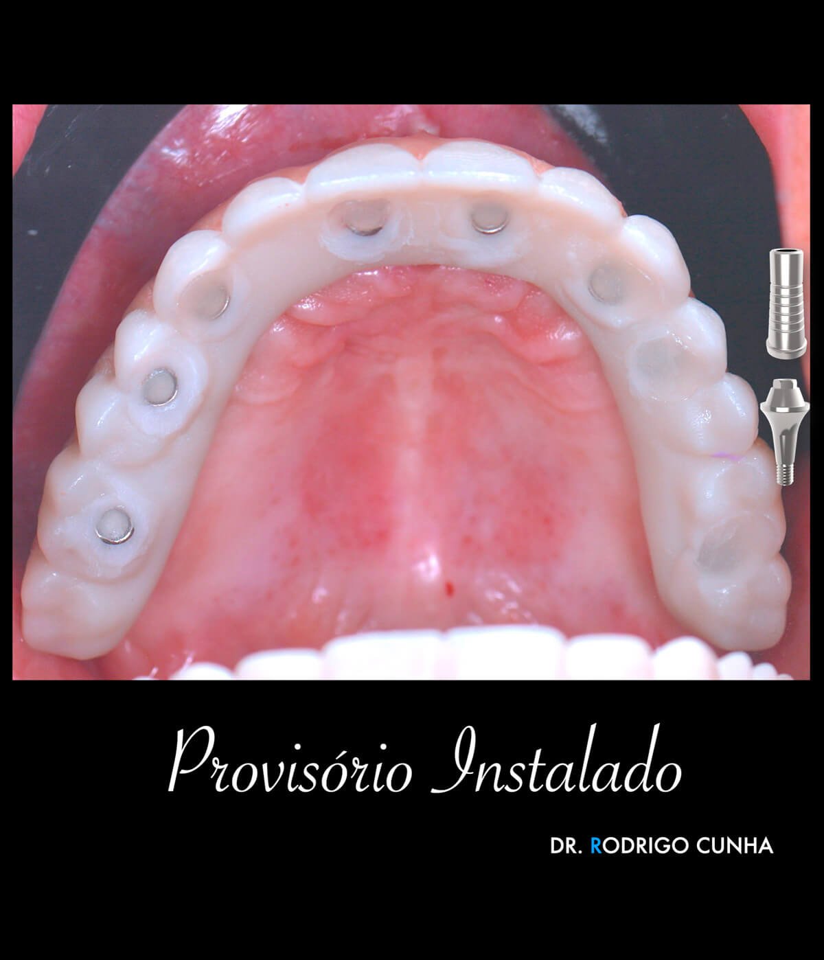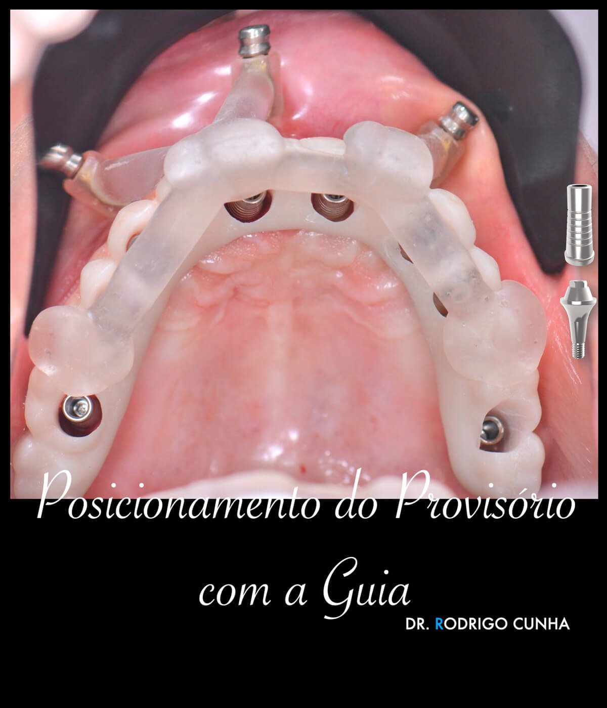 No momento da cirurgia guiada com implantes Maestro, já foram instalados os mini-cônicos e as coifas de titânio para fazermos a captura da prótese provisória impressa. Esta prótese foi estabilizada com uma guia de referência (localização), para a qual utilizou-se as mesmas perfurações dos pinos guias da guia prototipada para a instalação dos implantes.