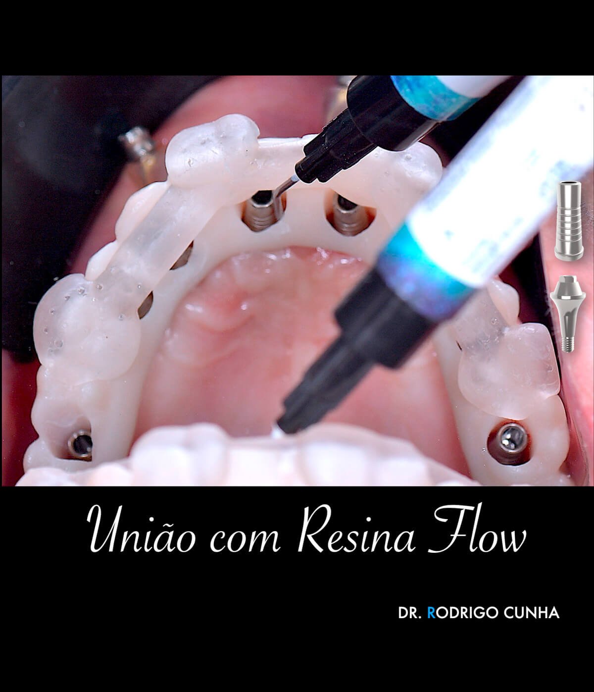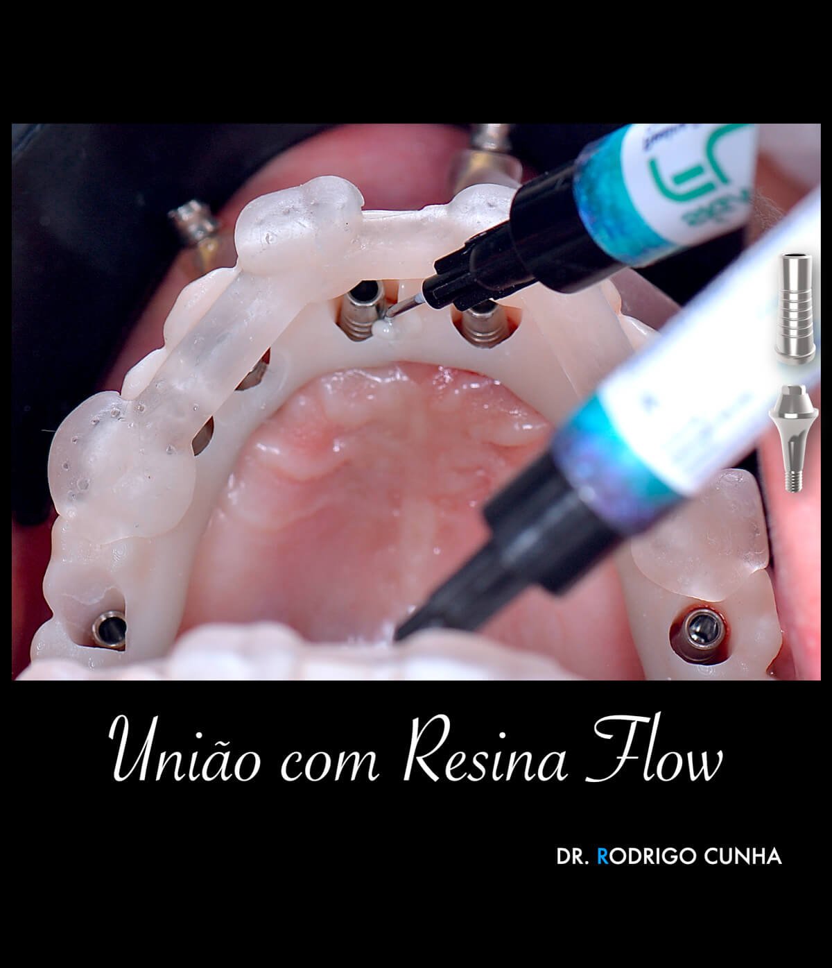 Após a estabilização da prótese impressa sobre a guia de localização e sobre as coifas de titânio, realizamos a união e preenchimento com resina Flow.