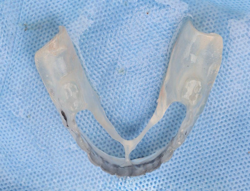 Paciente de 62 anos, do sexo feminino, sem comorbidades e história médica pregressa, apresentava severa reabsorção óssea em regiões anteriores e posteriores da mandíbula devido a uma peri-implantite (Figuras 1A e 1B). Feita a remoção dos implantes, a paciente optou por utilizar uma prótese total mucossuportada até a nova intervenção com prótese do tipo protocolo inferior. Após seis meses, a mandíbula encontrava-se cicatrizada (Figura 2). Como parte do protocolo diagnóstico, foi realizada tomografia computadorizada pela técnica do duplo DICOM. Com a severa perda óssea em região anterior de mandíbula, optamos por realizar a cirurgia de forma guiada, aumentando a previsibilidade e precisão da cirurgia. Os arquivos obtidos foram exportados para o software CoDiagnostiX, possibilitando a realização do planejamento reverso e o subsequente posicionamento virtual dos implantes (Figura 3). Com base no planejamento, optou-se pela instalação de quatro implantes Implacil Osstem CM AR Due Cone (3,5 x 7 mm), associados a mini-cônicos de 1,5 mm (Figuras 4A, 4B, 4C, 4D e 4E). A partir da tomografia da prótese da própria paciente, confeccionaram-se duas guias cirúrgicas: uma guia de pino de fixação (Figura 5) e uma guia de fresagem para a instalação dos implantes (Figura 6). Durante o procedimento cirúrgico, inicialmente foi posicionada a guia de pino de fixação para fresagem dos pinos de fixação e orientação da sequência cirúrgica (Figura 7). Após essa etapa, a guia foi substituída pela guia de fresagem dos implantes (Figura 8), utilizada para a fresagem e inserção dos implantes planejados (Figura 9). Concluída a instalação, optou-se por seguir o fluxo analógico, com a adaptação dos mini-cônicos 1.5 mm (Figura 10), realização da transferência de moldagem com silicona de adição leve e sutura com fio absorvível Vycril 6-0. O guia inicial foi adaptado com broca Maxicut, possibilitando sua utilização como molde de orientação para o laboratório protético (Figura 11). Após a moldagem, foram posicionadas as tampas de proteção sobre os implantes. Na fase protética, transcorridas 48 horas do procedimento cirúrgico, foi realizada a prova clínica da barra metálica e dos dentes (Figura 12). Na etapa subsequente, 72 horas após a cirurgia, procedeu-se à instalação e entrega do protocolo mandibular inferior e radiografia prévia, reabilitando funcional e esteticamente a paciente em curto espaço de tempo (Figuras 13A e 13B).
