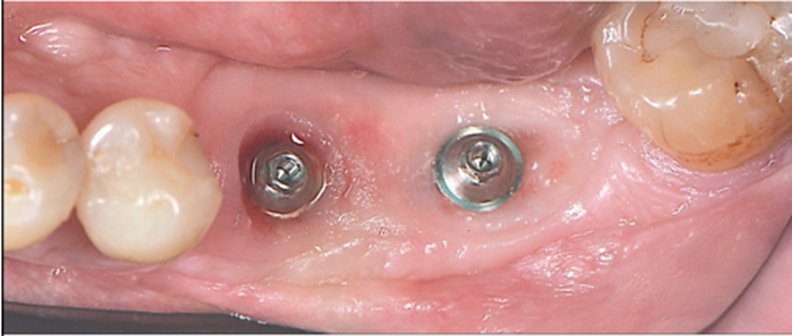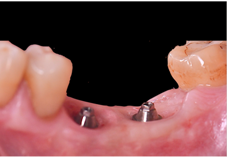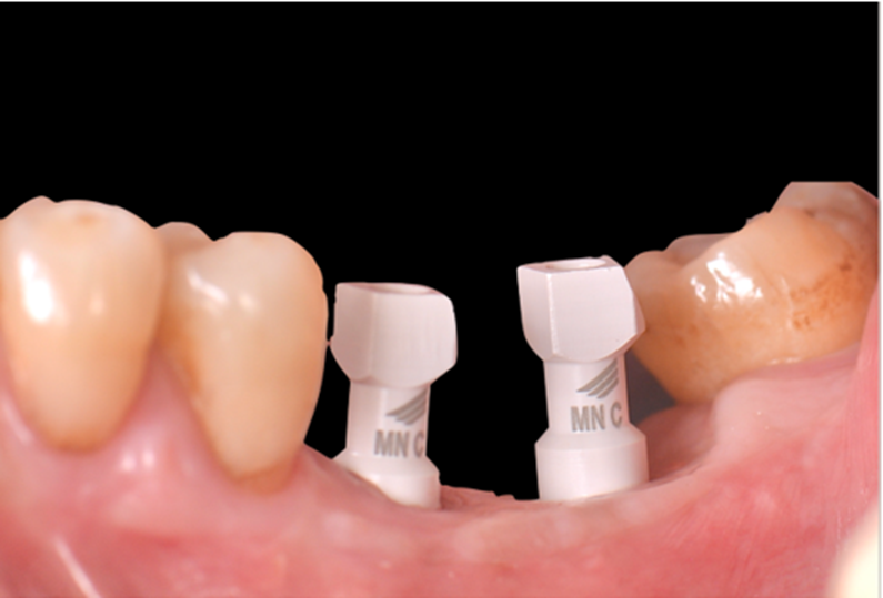 Após o período de osseointegração dos implantes, a altura correta do transmucoso de cada Mini Cônico foi selecionada utilizando-se o medidor tunel check, e os pilares foram instalados com um torque de 20 Ncm. Sobre os componentes, foram confeccionados provisórios para a personalização do perfil de emergência.