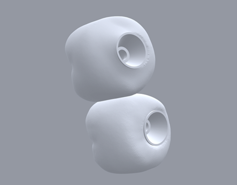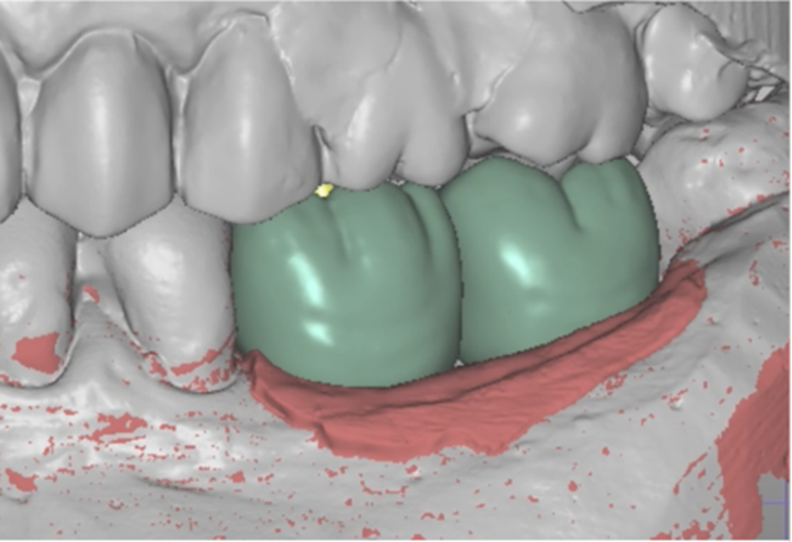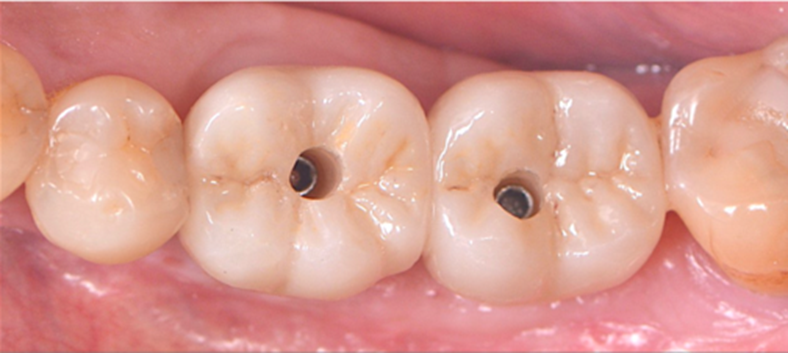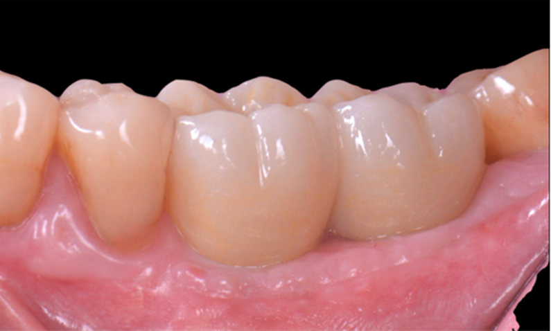 Neste caso, a prótese múltipla foi desenhada sobre o Mini Cônico e as duas coroas foram fresadas unidas. Após a maquiagem final da zircônia monolítica, as coroas foram parafusadas sobre o Mini Cônico com um torque de 10 Ncm.