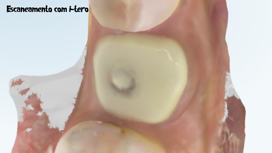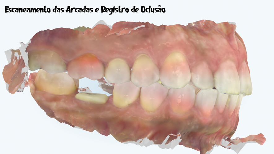 Após o período de osseointegração e estabilização do perfil de emergência (Figura 2), foi realizado o escaneamento das arcadas utilizando o iTero com o intuito de capturar ambas as arcadas, sendo o cicatrizador personalizado em posição e o registro de oclusão previamente à colocação do transferente digital, uma vez que o mesmo não permitiria o adequado registro de oclusão por falta de espaço interoclusal. (Figuras 3 e 4)