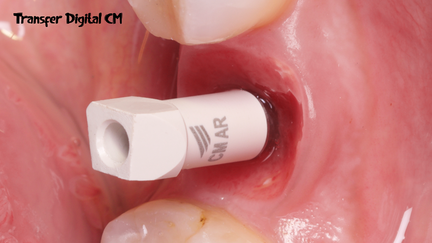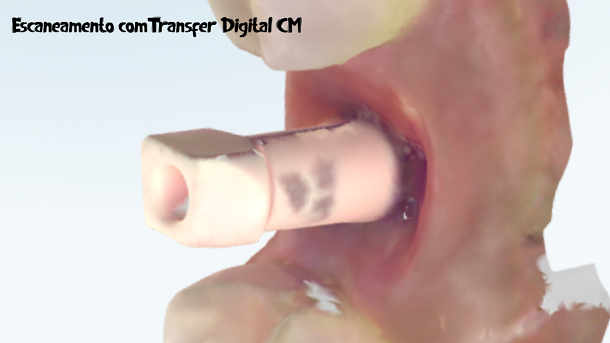 Logo em seguida à remoção do cicatrizador, foi colocado um transfer digital CM AR (Implacil De Bortoli) para a realização de um novo escaneamento (Figuras 7 e 8), com o objetivo de obter o posicionamento do implante. O mesmo carrega o perfil de emergência distorcido, uma vez que imediatamente à remoção do cicatrizador personalizado, a mucosa peri-implantar tende a sofrer deformações.