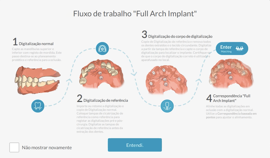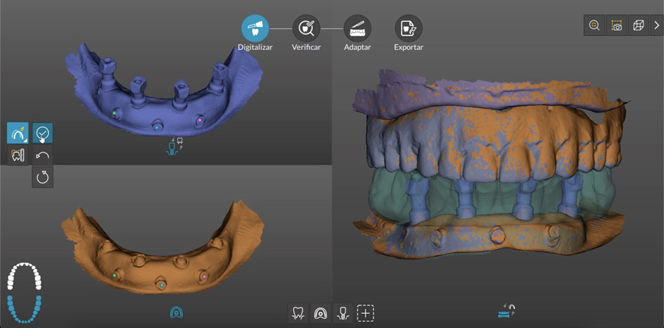 Com o novo fluxo de trabalho Full Arch Implant (Figura 1), você pode digitalizar a prótese provisória capturada, o antagonista e a oclusão, a prótese provisória capturada com marcadores de referência e o posicionamento tridimensional dos implantes ou componentes através dos transferentes digitais e, em seguida, combinar todas as três digitalizações em oclusão e enviar para o laboratório de sua preferência de uma só vez.
