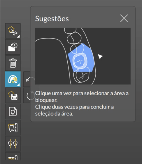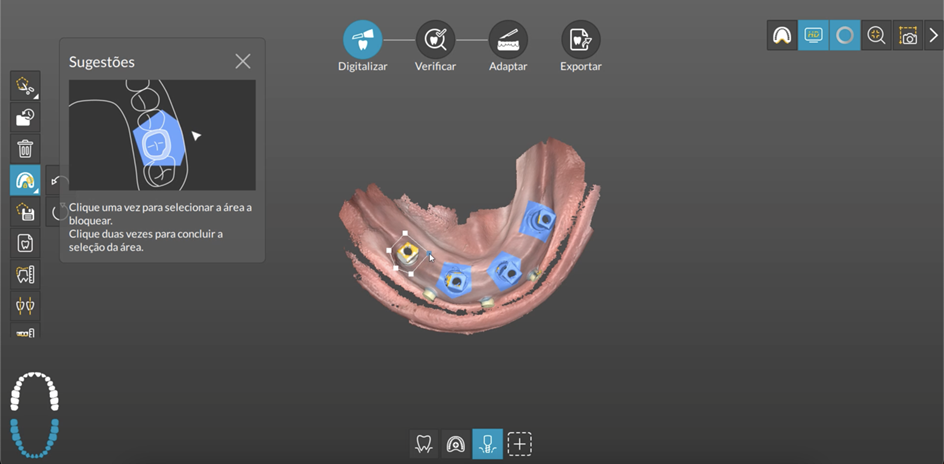 Sempre que estamos escaneando implantes ou componentes múltiplos podemos utilizar a ferramenta Bloqueio. Esta ferramenta faz o travamento da digitalização de uma região que você não quer alterar e/ou manter, sem duplicar a digitalização numa situação onde estamos utilizando transferentes digitais múltiplos. Podemos usar a ferramenta de bloqueio para evitar que áreas sejam redigitalizadas e ter certeza de que terá uma digitalização limpa e precisa. Para ativar a ferramenta de bloqueio, basta clicar no botão bloqueio (Figura 4) que ficará azul quando selecionado. Com esta ferramenta ativada, você pode selecionar a área específica que deseja bloquear clicando com o botão esquerdo, arrastando e ligando os pontos na área que queremos bloquear. Ao final, clique duas vezes com o botão esquerdo para terminar e a área marcada será destacada em uma cor azul (Figura 5) para indicar que agora está bloqueada e que o scanner não vai poder alterar ou redigitalizar essa região bloqueada.