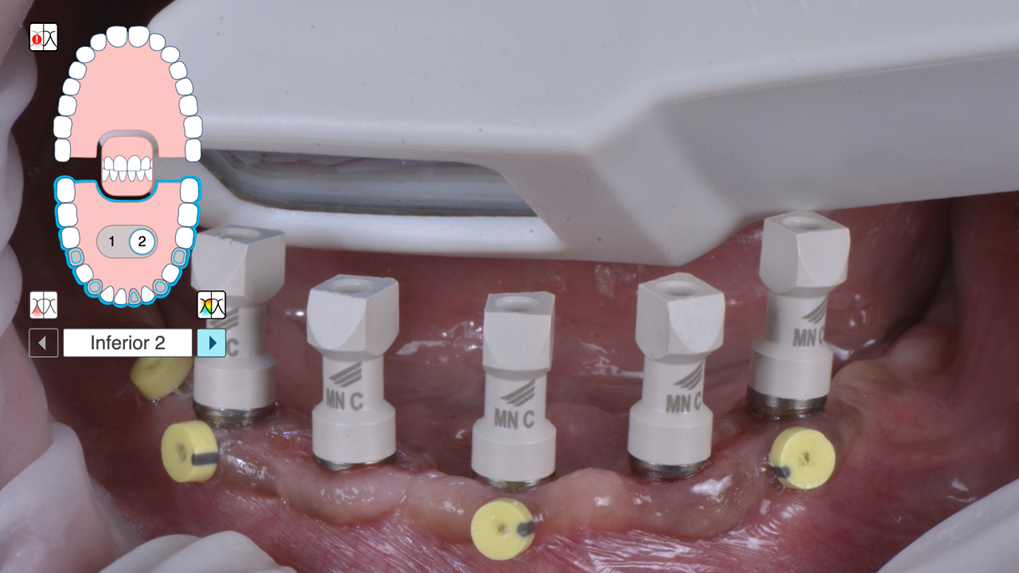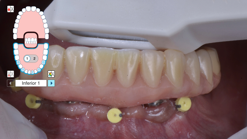 4- Faça o escaneamento da prótese provisória aparafusada e não esqueça de escanear bem os marcadores aderidos na mucosa queratinizada. Pode ser necessário desabilitar a limpeza automática no scanner iTero. No gráfico das arcadas no iTero aparecerão os números 1 e 2. Sendo o número 1 referente ao escaneamento pré-tratamento (Figura 3).