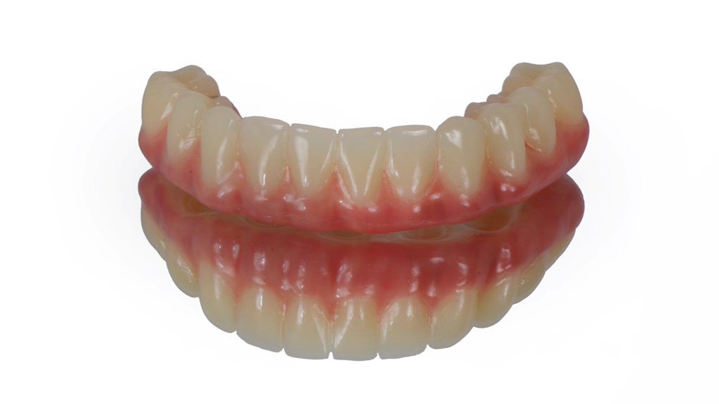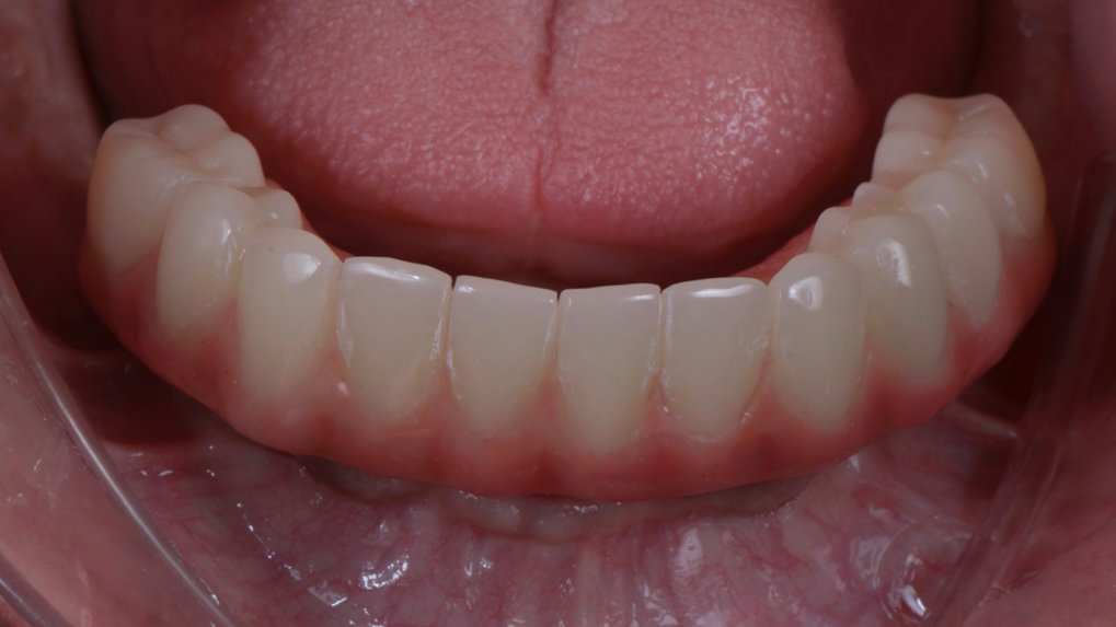 O uso de zircônia monolítica para restaurações de implantes de arco completo tem aumentado.4,5,17,20 O projeto da prótese (duplicata da prótese provisória) é parte integrante do fluxo de trabalho para restaurações de zircônia monolítica.4,5,21,22 O protótipo da prótese inclui todas as informações necessárias e relevantes para o paciente para a confecção da prótese definitiva, como contornos, corredores bucais, estética, dimensão vertical de oclusão, morfologia oclusal e dentária e relação maxilomandibular.4,5,9,18