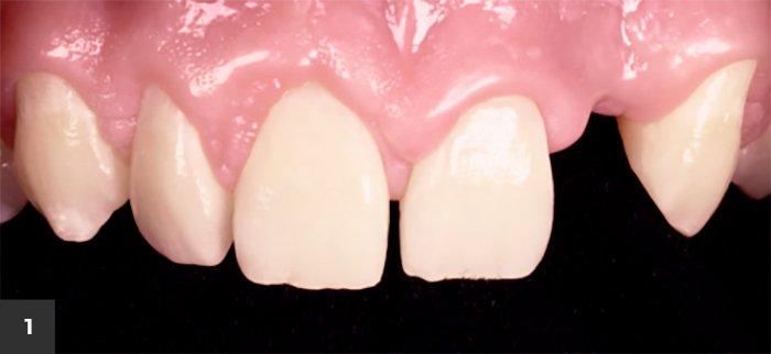 Figura 1 – Vista frontal dos incisivos superiores. Paciente com histórico de avulsão do elemento 22 em acidente automobilístico.