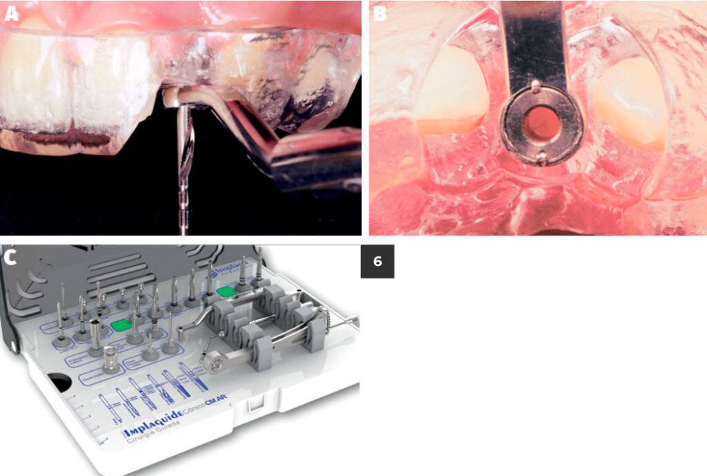 Figura 6 – Prova do guia impresso e fresagem óssea guiada para instalação do implante osseointegrado. Em procedimentos cirúrgicos guiados, é imperativo o emprego de kits cirúrgicos apropriados. Neste caso, foi empregado o kit Implaguide (Implacil De Bortoli).