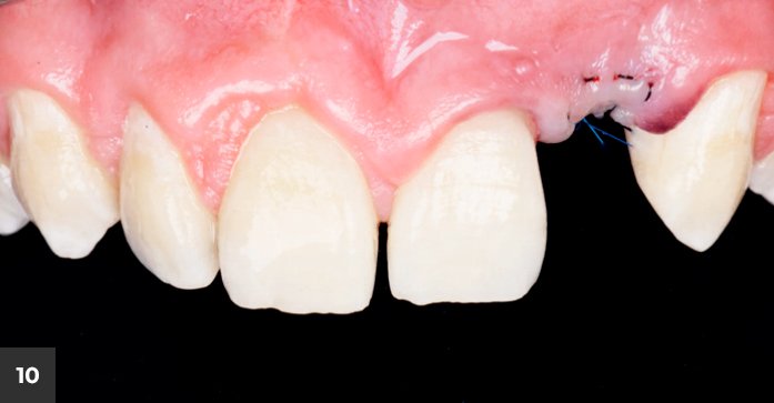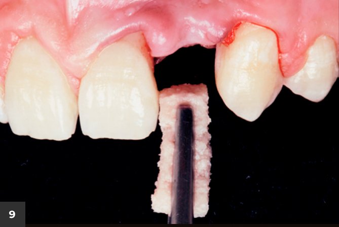 Figura 9 – Realizou-se enxerto ósseo aloplástico na face vestibular (Bio-Oss Colagen, Geistlich) visando à regeneração desta região e redução da depressão provocada pela avulsão dental.