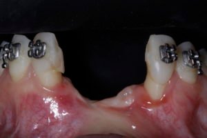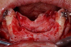 Após a extração dos referido dentes, o retalho de espessura total foi elevado para exposição completa do defeito ósseo. Veja a discrepância dos picos ósseos medial e distal na posição dos laterais, e a anatomia complexa do defeito.