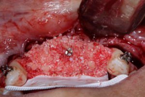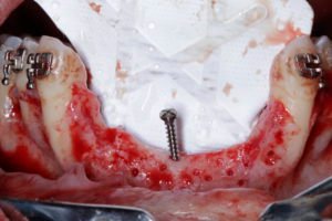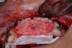 Um parafuso tipo tenda foi posicionado com a cabeça aproximadamente na altura dos picos ósseos residuais. A decorticalização foi feita, a membrana não reabsorvível de PTF-HD (Cytoplast 30×40 250) foi posicionada e fixada na região palatina, utilizando microparafusos autoperfurantes. O osso particulado (osso autógeno, dentina processada, matriz mineral bovina e LPRF) foi cuidadosamente posicionado e a membrana foi acomodada e fixada na região vestibular.