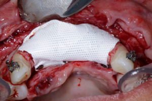 Houve precaução para que a membrana não tocasse os dentes adjacentes, seguido da proteção da membrana densa com membranas de LPRF. As suturas foram realizadas sem tensão usando monofilament 3.0 e 4.0 de teflon (Cytoplast). A radiografia periapical final mostra a magnitude da reconstrução.