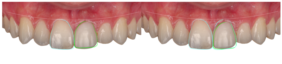 Como etapa inicial foi realizado um planejamento estético digital (Digital Smile Design – DSD), o qual possibilitou avaliar a simetria do sorriso, proporções dentárias e altura gengival. O DSD revelou uma migração coronal do tecido mole na região do 21, evidenciando uma coroa clínica encurtada e reforçando a importância da preservação do contorno gengival e do suporte tecidual para o sucesso da futura reabilitação.