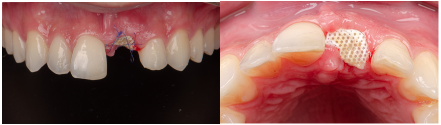 Com o objetivo de preservar o volume ósseo e a morfologia gengival, foi realizada uma regeneração óssea guiada (ROG) com o Extra Graft XG-13 aplicado na região vestibular para preenchimento do GAP entre o implante e a parede óssea. Na sequência, foi colocada uma membrana Cytoplast, em PTFE de alta densidade, adaptada sob o tecido gengival e estabilizada por sutura com nylon azul, promovendo selamento do sítio cirúrgico.