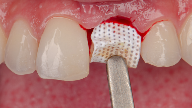 Já a membrana Cytoplast, confeccionada em PTFE de alta densidade (d-PTFE), reúne propriedades que a tornam uma aliada estratégica em procedimentos regenerativos onde o fechamento primário não é possível ou desejado. Seus poros ultrafinos (< 0,3 μm) impedem a penetração bacteriana mesmo quando a membrana está exposta à cavidade oral, proporcionando segurança durante o processo de cicatrização. Além disso, sua superfície texturizada Regentex, com microssulcos hexagonais, favorece a adesão dos tecidos periféricos e bloqueia a migração epitelial sobre o leito enxertado. Isso garante um selamento hermético e previsível do alvéolo, permitindo que a regeneração óssea ocorra sem interferência de tecidos moles. A facilidade de remoção ambulatorial da membrana também elimina a necessidade de nova cirurgia, otimizando o conforto do paciente e a eficiência clínica.