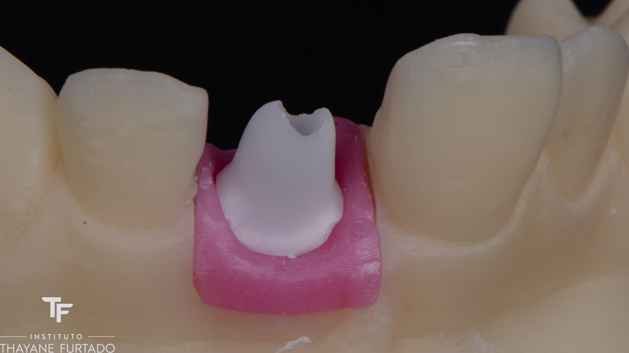 A coroa foi cimentada sobre o munhão de zircônia, formando um conjunto totalmente cerâmico e livre de metal. A ausência de componentes metálicos permitiu posicionar a linha de cimentação em nível discretamente subgengival com total previsibilidade, sem risco de escurecimento da margem e favorecendo um selamento eficaz aliado a um contorno gengival harmônico.