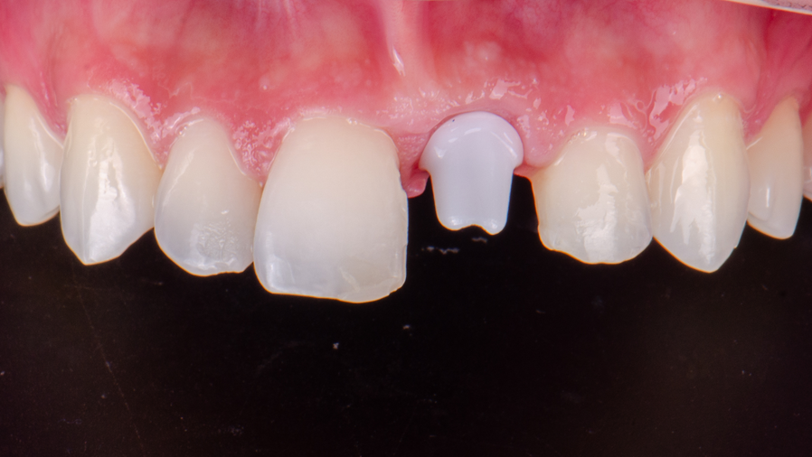 O uso da zircônia como material do munhão também foi crucial do ponto de vista estético: sua coloração branca e translúcida evita escurecimento gengival, especialmente em pacientes com biótipo fino. A coroa definitiva, confeccionada em cerâmica de dissilicato de lítio e fresada via CAD/CAM, completou o conjunto protético totalmente cerâmico e biomimético. Esse material, amplamente reconhecido por sua resistência e propriedades ópticas, foi capaz de reproduzir com fidelidade a cor, o brilho e a translucidez dos dentes naturais. A linha de cimentação foi posicionada em nível discretamente subgengival, promovendo um selamento eficaz e respeitando os limites biológicos, o que favorece o contorno gengival e evita qualquer sombreamento indesejado.