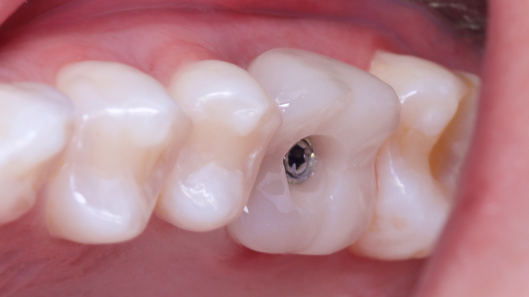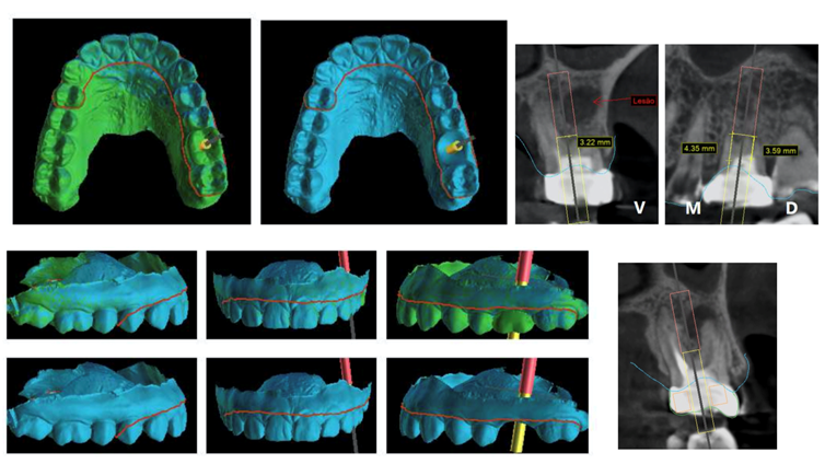 Paciente D.B., de 32 anos, procurou o consultório com queixa de dor no elemento 26. Após a avaliação da tomografia junto ao endodontista, constatou-se que o elemento estava condenado, sendo planejado a extração minimamente invasiva com instalação imediata do implante na região posterior superior do elemento 26. Tendo em vista que o implante imediato é dito como um segmento pelo qual ele será instalado no mesmo ato cirúrgico do dente extraído, foi confeccionado um guia e um provisório prototipados, para uma melhor visualização para a instalação do implante. Foi realizada a exodontia minimamente invasiva e na sequência a fresagem do kit IMPLAGUIDE 3.5/4.0 da Implacil De Bortoli. Depois, instalação do implante Maestro 3.5×11, do pilar Ideale 4.5×4 2,5 mm, mais a coifa de titânio de 4.5×4. Foi feito também a finalização do provisório com resina Flow para confecção dos contornos críticos e subcríticos, como também foi realizado o preenchimento do GAP e parafusado o provisório. Observou-se que a instalação do implante com guia e provisório prototipados ofereceu um melhor conforto ao paciente desde o inicio do tratamento: diminuiu a quantidade de anestésicos, o tempo cirúrgico, o pós-operatório e os edemas, além de proporcionar sucesso no tratamento restaurador. Para a confecção da cerâmica definitiva após o período de oito meses, bastou o escaneamento do provisório ainda em boca para a confecção direta da cerâmica definitiva em fluxo digital, uma vez que os escaneamentos da provisória, bem como do pilar, ja haviam sido feitos. Bastou então juntar as malhas em software (Exocad) para a finalização da reabilitação.