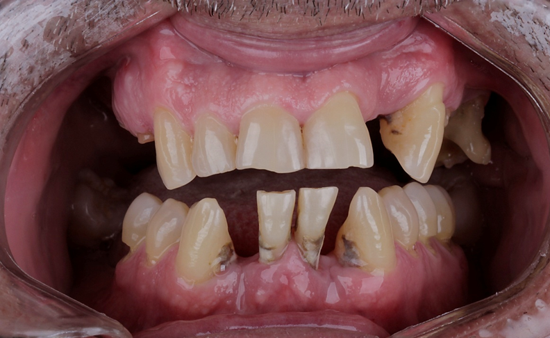 Figura 1 – Aspecto clínico inicial demonstrando presença de placa bacteriana nos dentes remanescentes 33, 31, 41 e 43 e ausência dos dentes 32 e 42, além de pequeno espaço mésio-distal entre os caninos inferiores que impedem o planejamento dos implantes individuais e consequentemente coroas individuais.