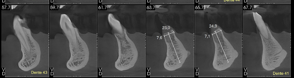 Figura 4 – Ilustração dos cortes tomográficos da região de interesse demonstrando plenas condições de instalação ápico coronal dos implantes – no caso, Veloce de 3.3x11mm.