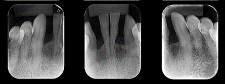 Figura 2 – Aspecto da radiografia periapical da região de interesse (dentes 33 a 43), demonstrando perda óssea dos dentes 31 e 41 e pequeno espaço mésio-distal para a instalação de implantes unitários (31, 32, 41 e 42).