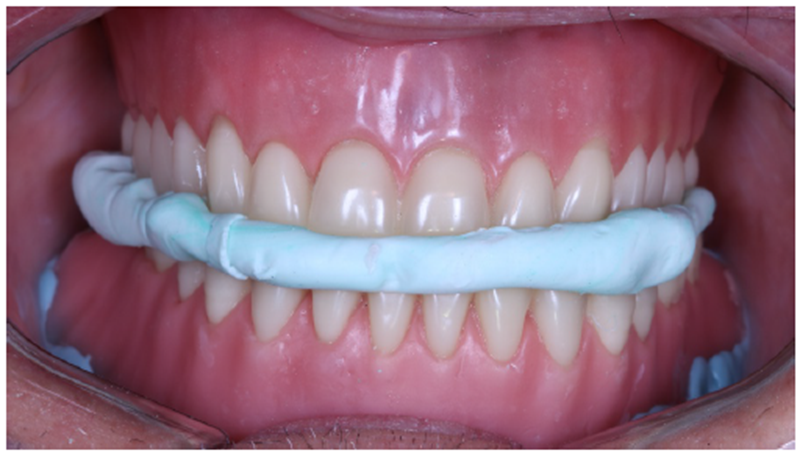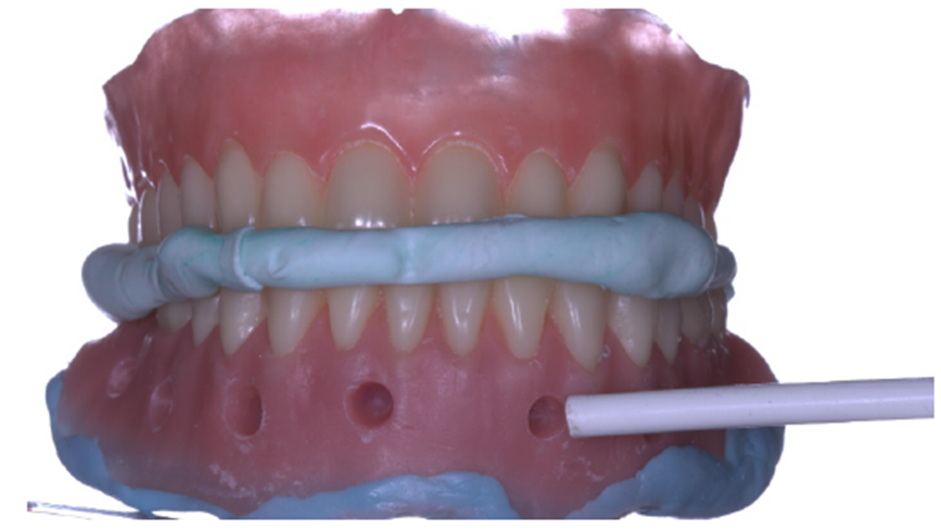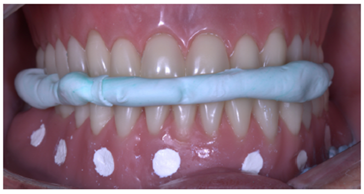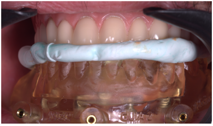 Figura 2 – Prótese inferior estabilizada na correta oclusão com silicona pesada.