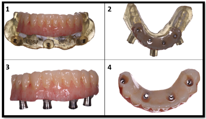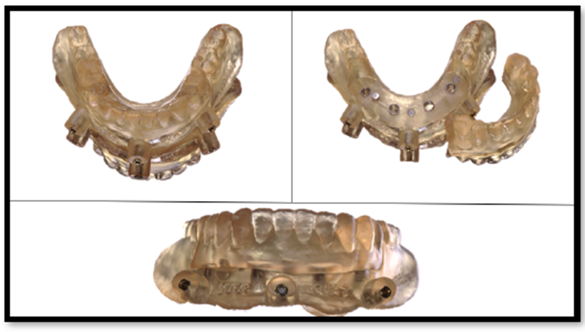 Após a avaliação do paciente e levando em consideração o conceito de tratamento com planejamento reverso, foi proposto uma prótese muco suportada superior e implantossuportada inferior ancorada em quatro implantes, utilizando a técnica de cirurgia guiada.