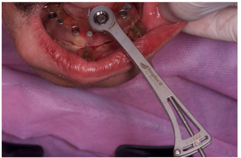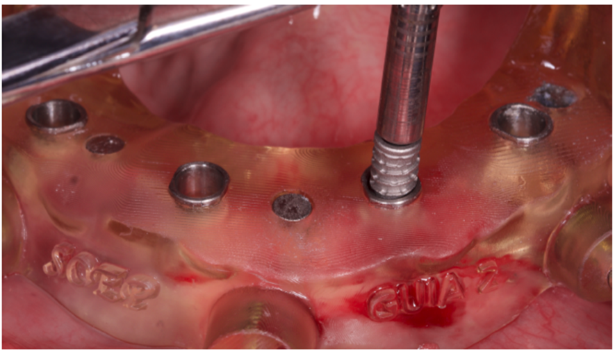 A cirurgia guiada para instalação dos implantes foi realizada em clínica odontológica sob anestesia local, sem a necessidade de abertura de retalhos em virtude da adequada adaptação do guia prototipado sobre o tecido mucoso. O kit de cirurgia guiada utilizado foi o Raptor (Implacil De Bortoli – São Paulo – SP, Brasil).