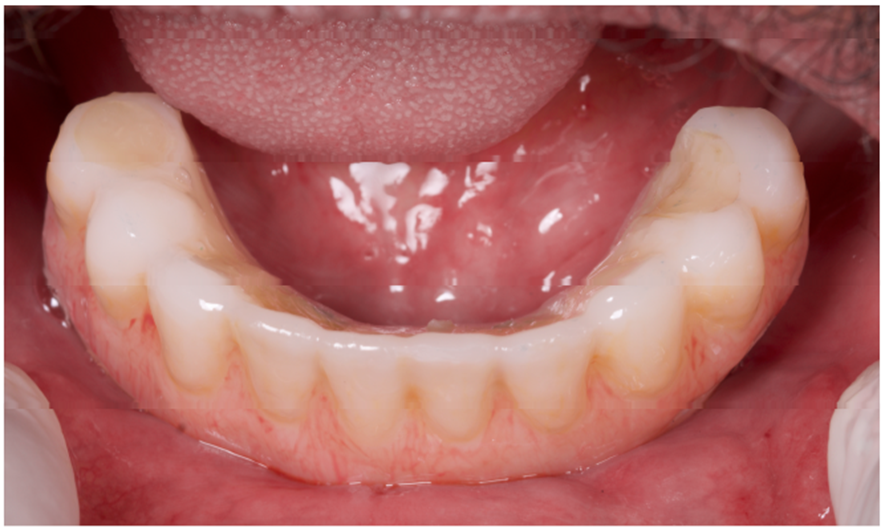 Em seguida, foram colocadas as coifas de titânio (Figura 11) e capturados com resina Alike 60 em uma prótese provisória, já impressa e maquiada pelo laboratório utilizando com encaixe na guia prototipada confeccionada para sua captura, e feito o devido acabamento e polimento da prótese provisória e posteriormente o ajuste de oclusão (Figuras 12 e 13).
