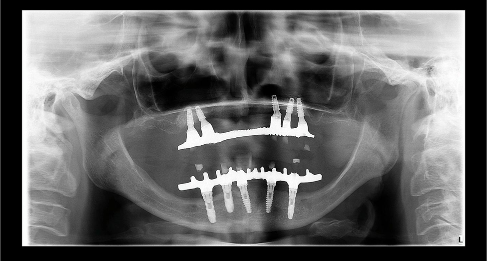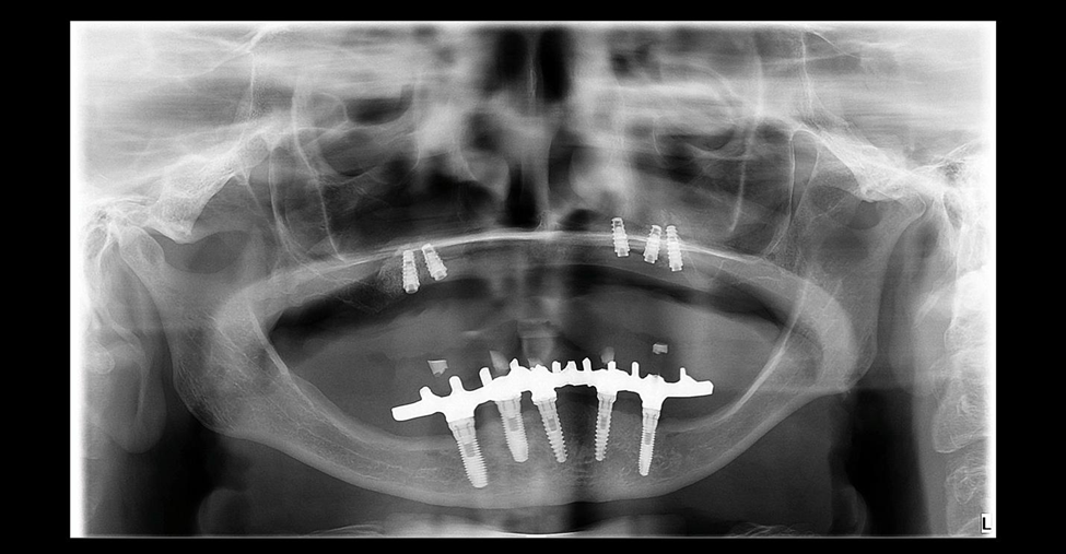 Foto 5 – Radiografia panorâmica pós-operatória mostrando os implantes instalados.