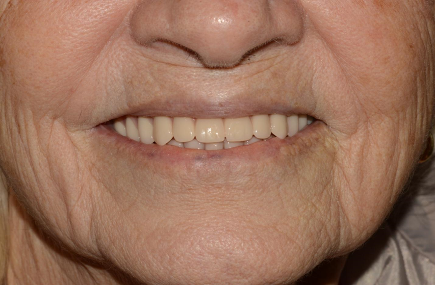 Foto 7 – Fotografia extraoral do sorriso da paciente reabilitada com a prótese protocolo.